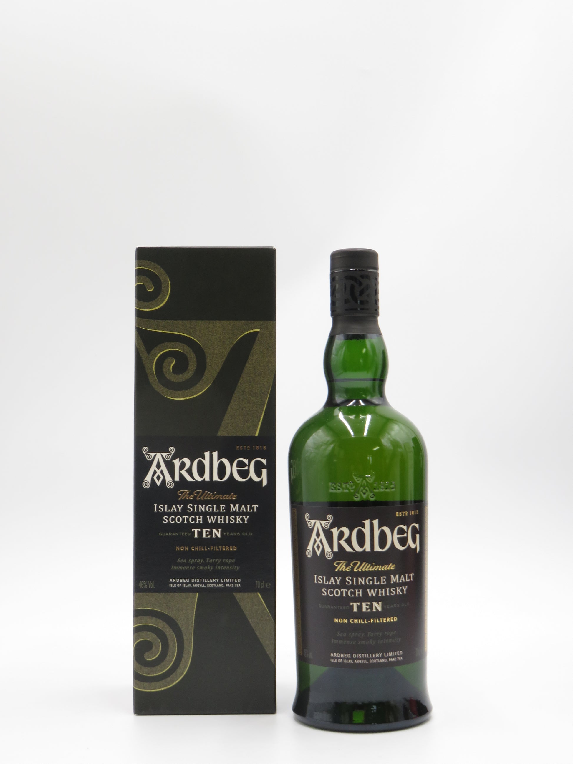 アードベッグ 10年は、アイラ島を代表するスモーキーシングルモルトの定番です。力強いピート香に、柑橘やバニラの甘み、海の潮風を思わせるミネラル感が重なり、複雑で奥行きのある味わいを生み出しています。